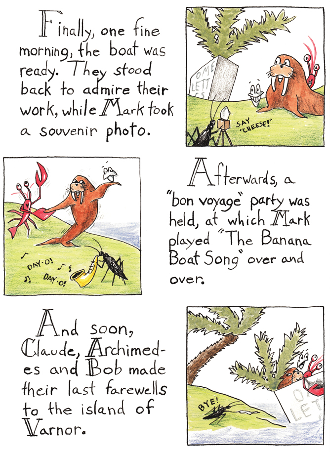 The basic premise is that three animals live together on a deserted island - Bob the clam, Archimedes the walrus, and Claude the lobster - and they are persuaded by a saxaphone-playing beetle called Mark to voyage around the world in a cardboard box with the word 'OMELETTES' painted on the side.