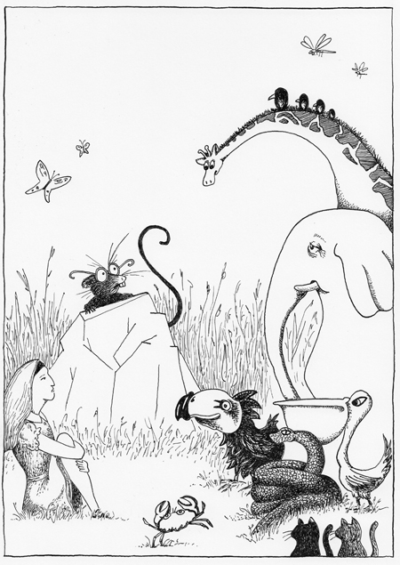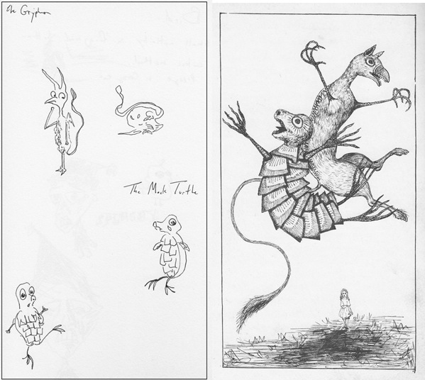 The big stumbling block for me was always the Gryphon and the Mock Turtle; finally it occured to me to base them on Lewis Carroll's original conceptions from 'Alice's Adventures Under Ground'. I think these came out all right - but of course after that episode comes the trial, which always scared the heck out of me. All those cards! But the inspiration finally came to me.