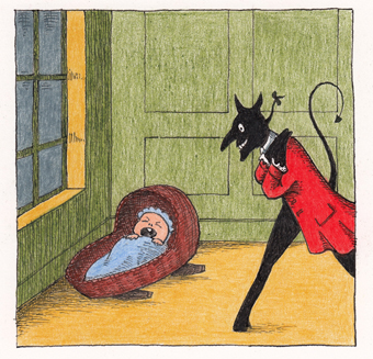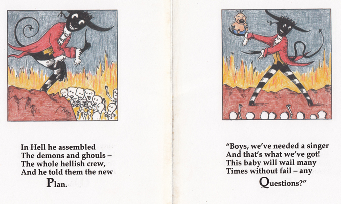 This project was an alphabet book, based on an old Irish ballad called 'The Women Are Worse Than The Men', in which the Devil takes a shrewish wife down to Hell, only to return her because she's too irritating. I liked the idea, but thought that children would respond better to an annoying new brother or sister.