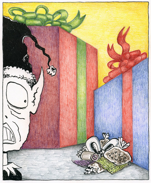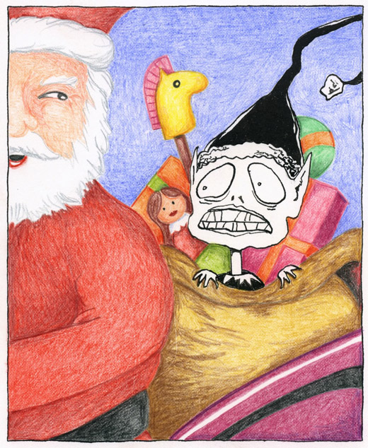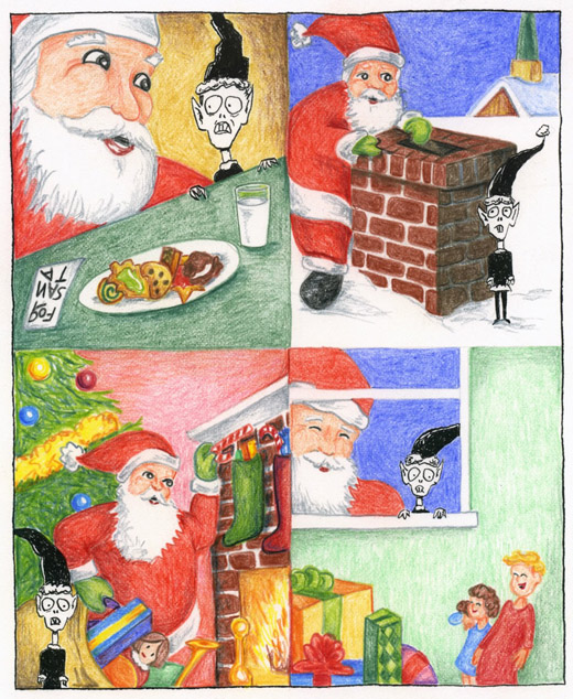 Since I never actually learned how to draw properly, I always felt the pictures of the German Expressionist Splashy turned out to be far less alarming than the completely deranged-looking figures of Santa and the other elves . . . though I must say I think it works as is.
