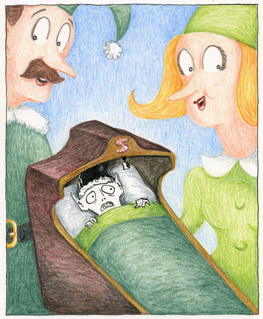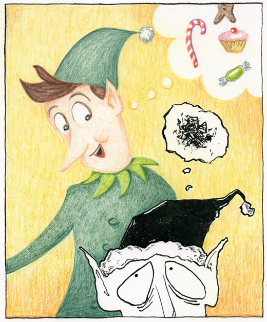 He tries to get into the spirit of things, but the toys he makes - bedpans and bags of wood-shavings - really go over badly with the rest of the elves.